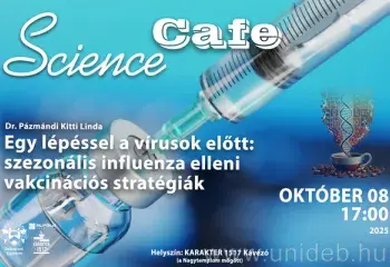 Folytatódik a Debreceni Egyetem ismeretterjesztő sorozata a Science Cafe az intézmény Tudományos Igazgatóságának szervezésében. A félév indításaként október 8-án, szerdán 17 órától Egy lépéssel a vírusok előtt: szezonális influenza elleni vakcinációs stratégiák címmel Pázmándi Kitti Linda, a Debreceni Egyetem (DE) Általános Orvostudományi Kar (ÁOK) Immunológiai Intézet adjunktusa tart előadást a KARAKTER 1517 Könyvesbolt és Kávézóban (Debrecen, Nagytemplom mögötti Emlékkert).